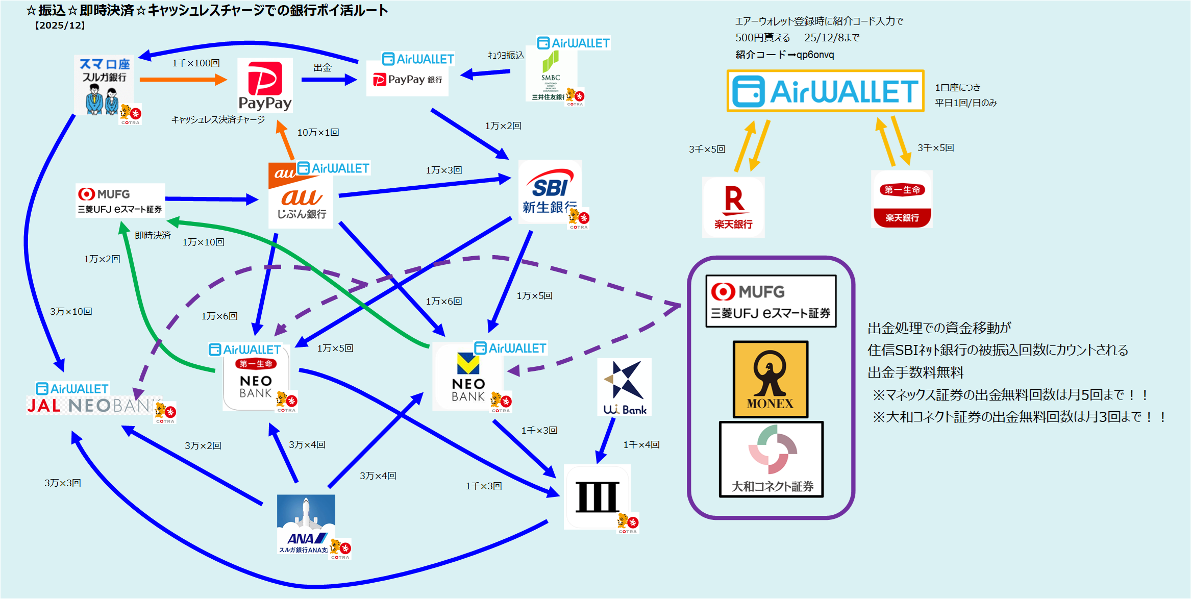 やり方は、①入金:定額自動入金の設定 ②口座振替:au Payカード引落 ③キャッシュレス決済:PayPayへ10万入金→PayPay銀行出金 ④エンタメ:SPAT4へ100円入金→自動出金 ⑤資産運用:auマネーコネクト。