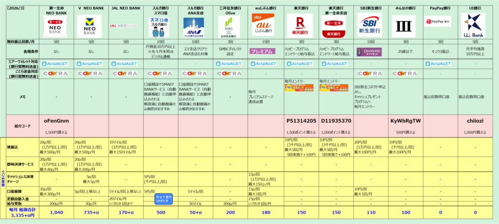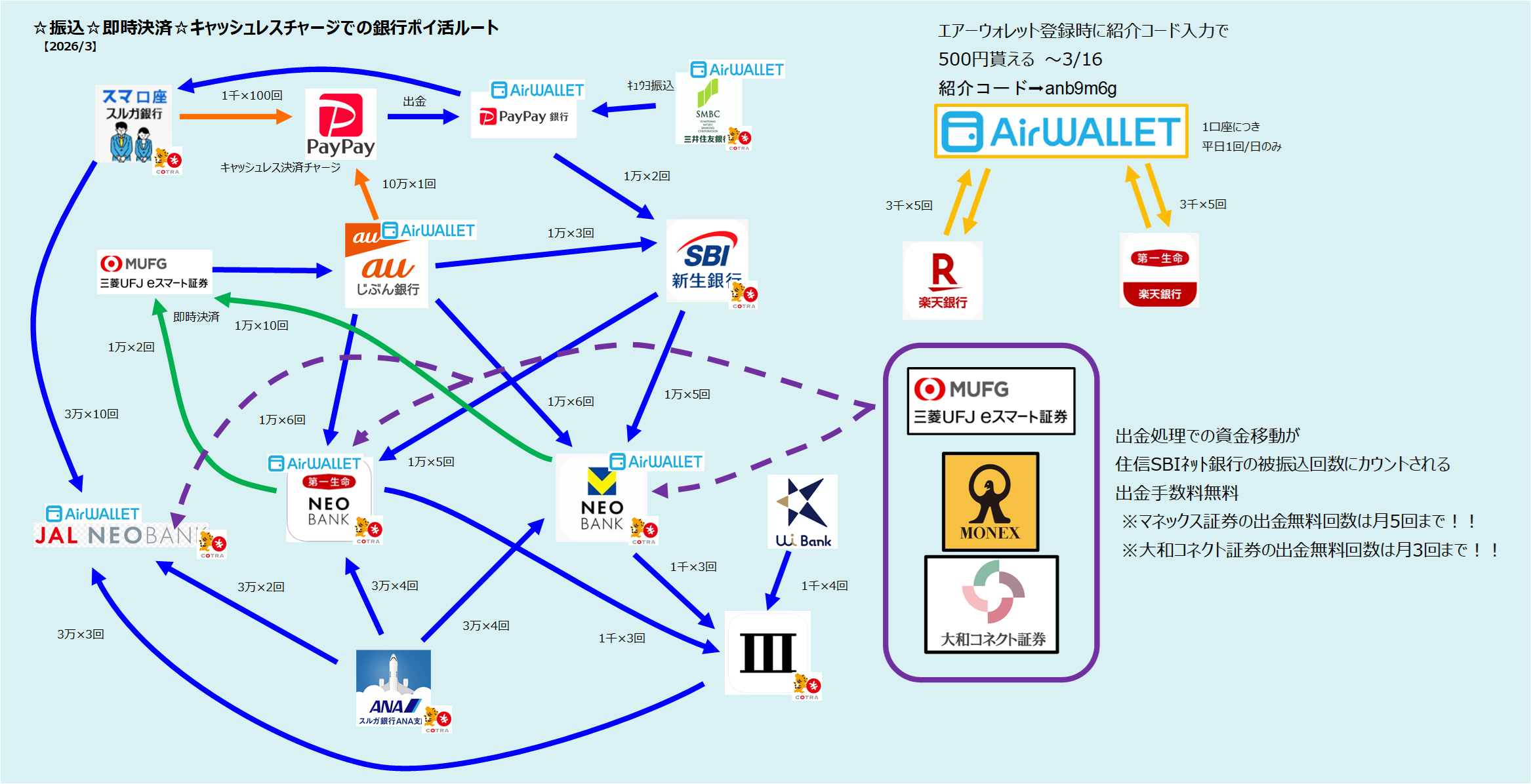どの銀行も無料振込回数を使い切らないようにしています。多少手間ですが、ほとんどのポイントをこのルートで稼げます。