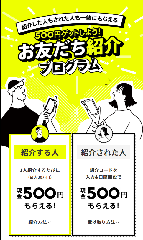 まだ口座開設してない方は口座開設時に紹介コードを入力することで現金500円がもらえます