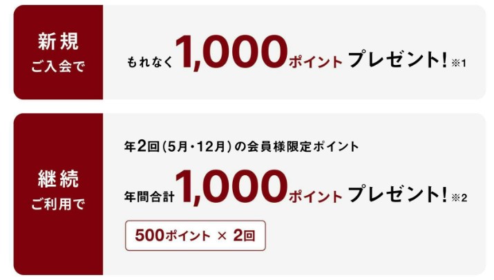 カード所有特典 | 年間1,000ポイント(500ポイント×2回) |