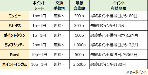 おすすめのポイントサイトの概要を比較します。特にポイント有効期限は忘れずに、せっかくのポイントを無くしてしまわないようにしましょう。